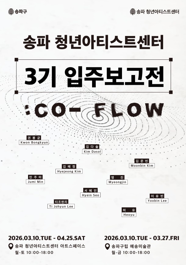 「공동의 흐름 Co-flow」는 송파 청년 아티스트센터 제3기 입주작가 10인의 작업을 소개하는 입주보고전이다. 서로 다른 매체와 작업 세계를 지닌 작가들은 풍납동이라는 장소에서 각자의 흐름을 펼쳐 보이며, 하나로 합쳐지지 않는 흐름들이 나란히 공존하는 상태를 드러낸다. 이를 통해 예술과 지역이 함께 만들어갈 공동의 시간의 가능성을 제시한다.
