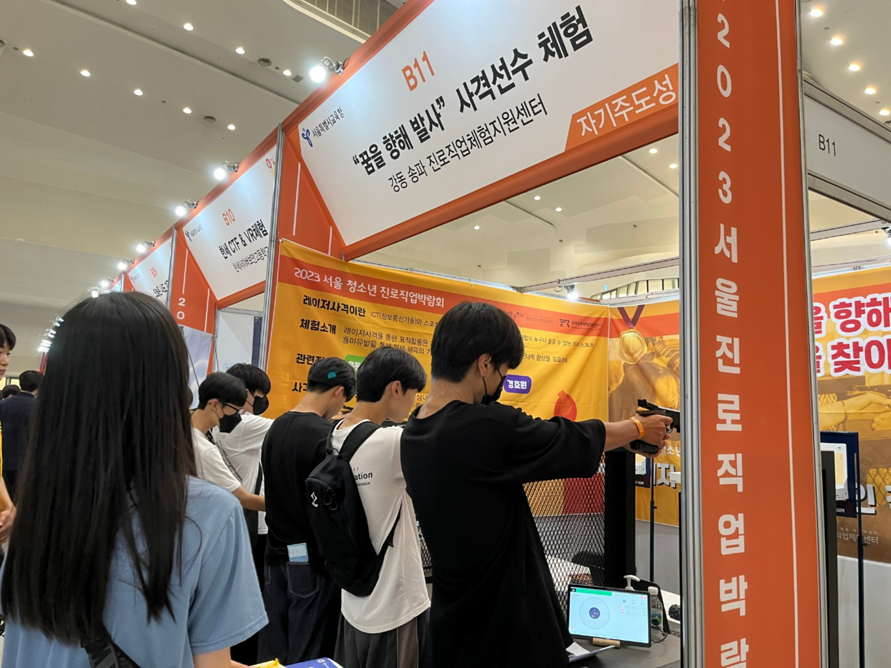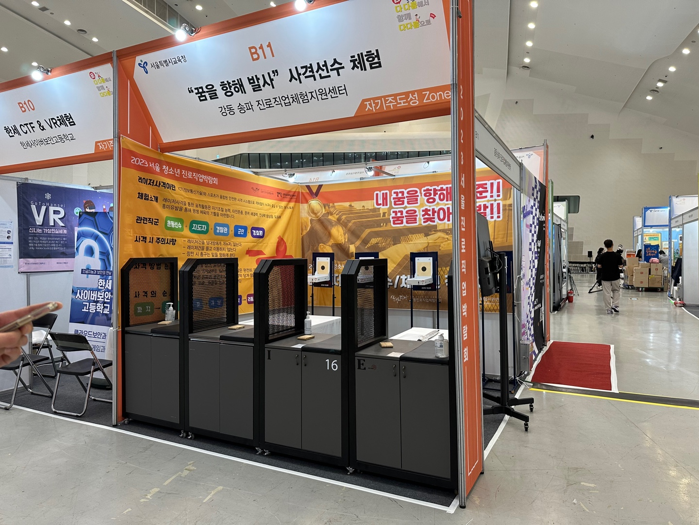 송파진로직업체험지원센터 꿈마루 역시 강동진로직업체험지원센터 상상팡팡과 함께 직업체험 부스를 운영하였는데요~ 많은 학생들이 관심과 흥미를 가지고 있는 레이저 사격을 주제로 "꿈을 향해 발사!" 사격선수 직업체험을 진행하였답니다.