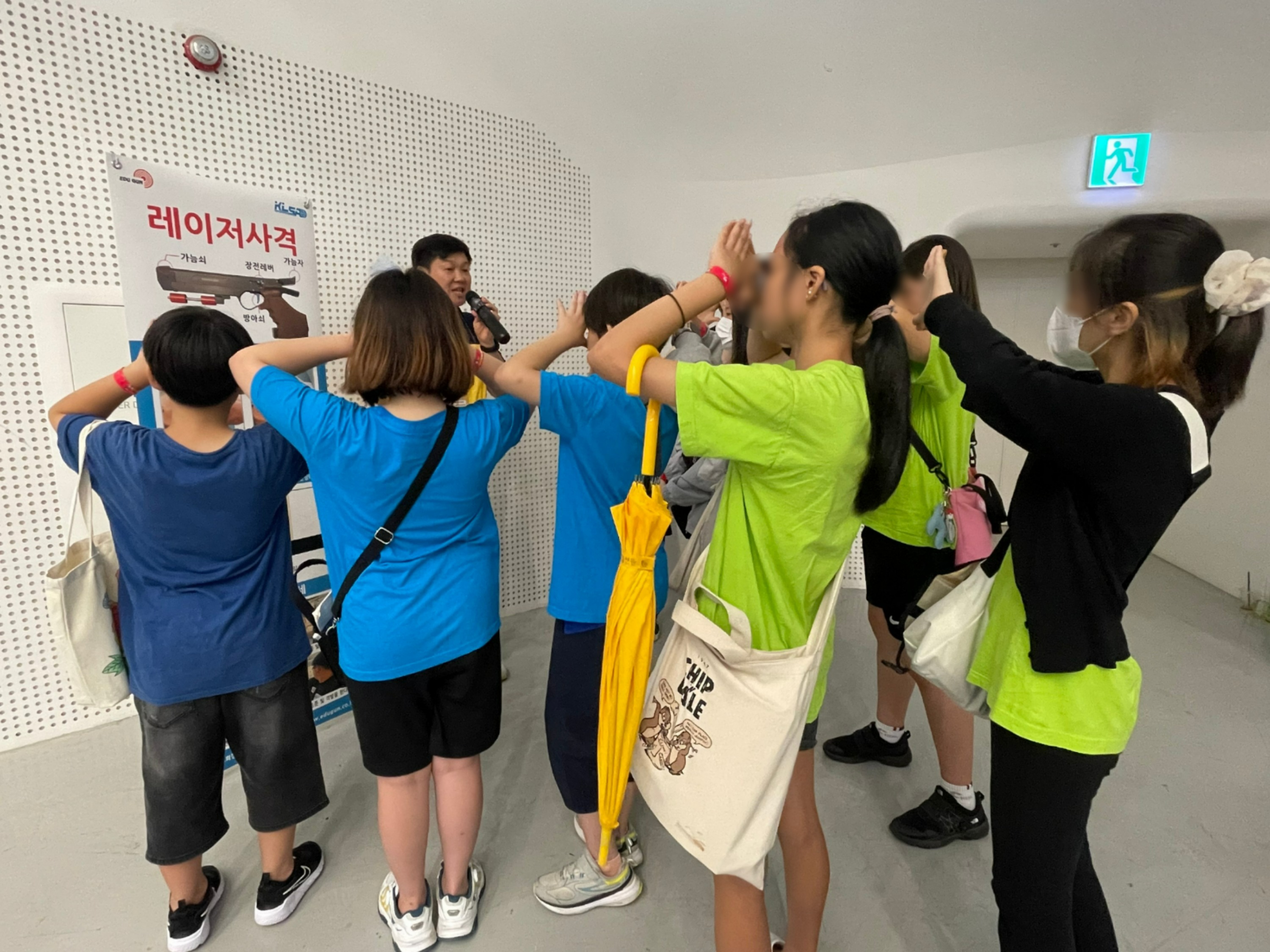 사격 교육이 진행 된 후, 체험부스로 이동하여 진짜 레이저 사격 총으로 과녁에 맞춰보는 체험을 하였어요! 총을 장전하고, 호흡을 가다듬고, 가늠쇠와 가늠자를 과녁에 조준하여 방아쇠를 눌러 빵!! 총 10발을 쏴보며 일일 사격선수가 되어 보는 시간이 되었답니다!