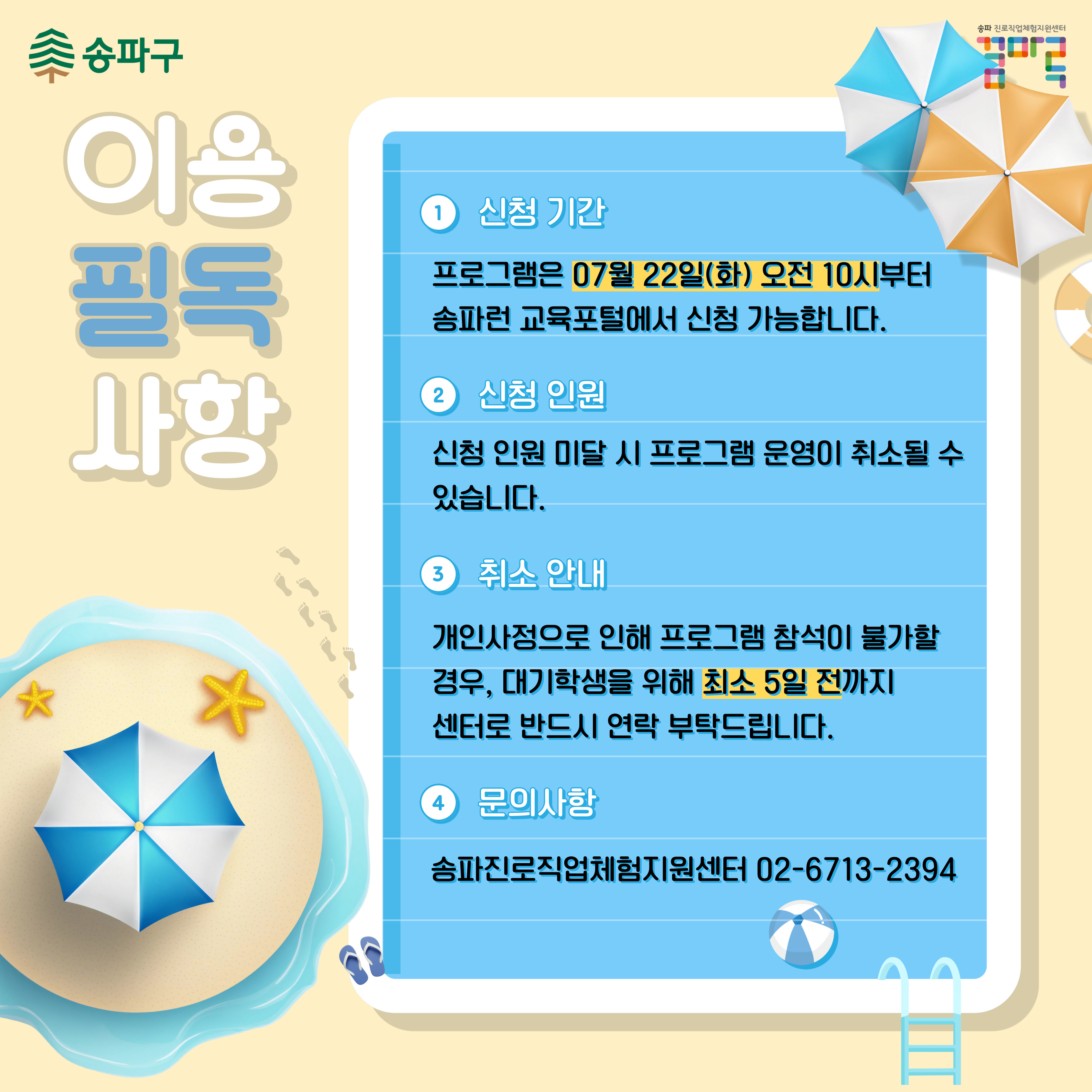 프로그램은 07월 22일(화) 오전 10시부터 송파런 교육포털 홈페이지에서 신청 가능합니다.