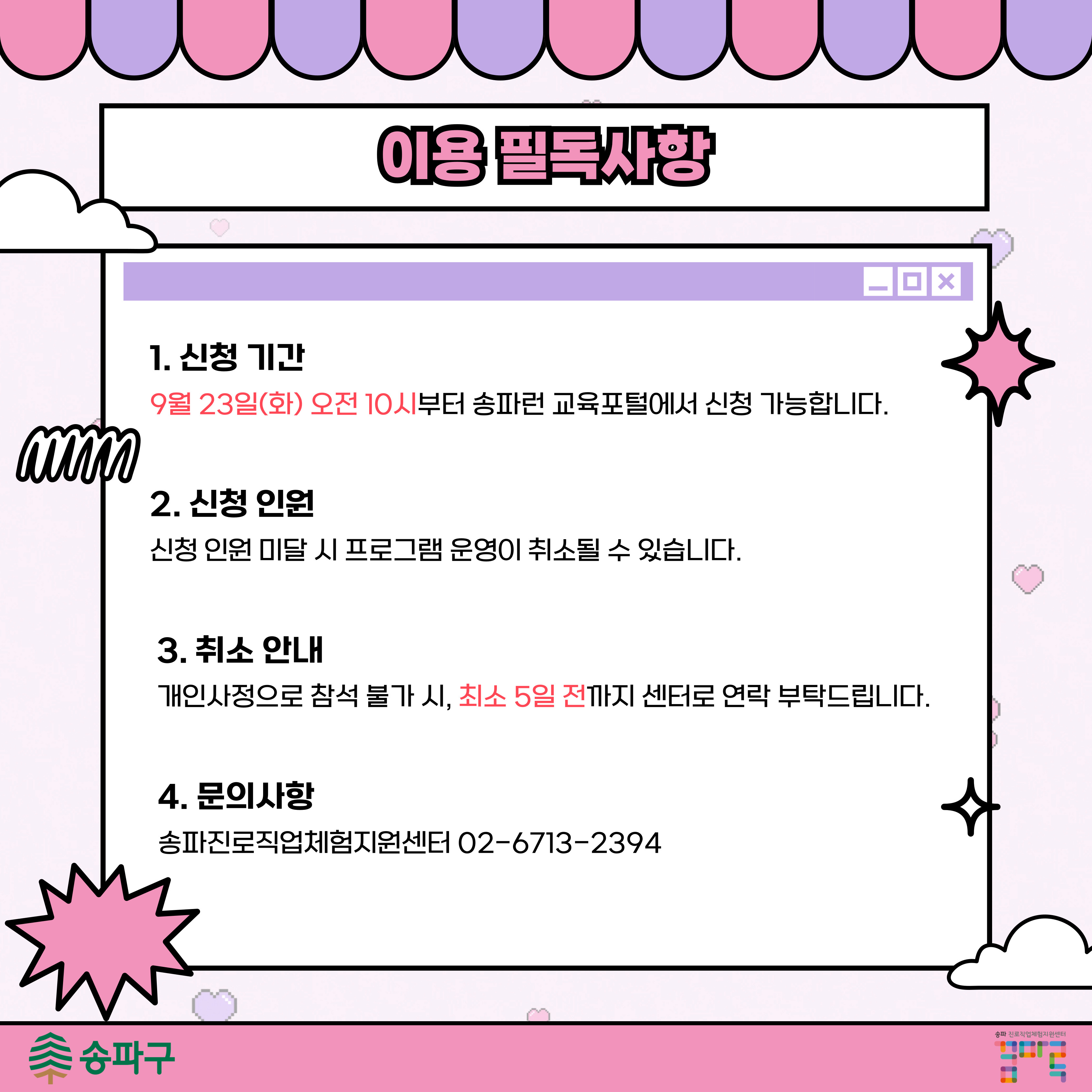 프로그램은 09월 23일(화) 오전 10시부터 송파런 교육포털 홈페이지에서 신청 가능합니다.