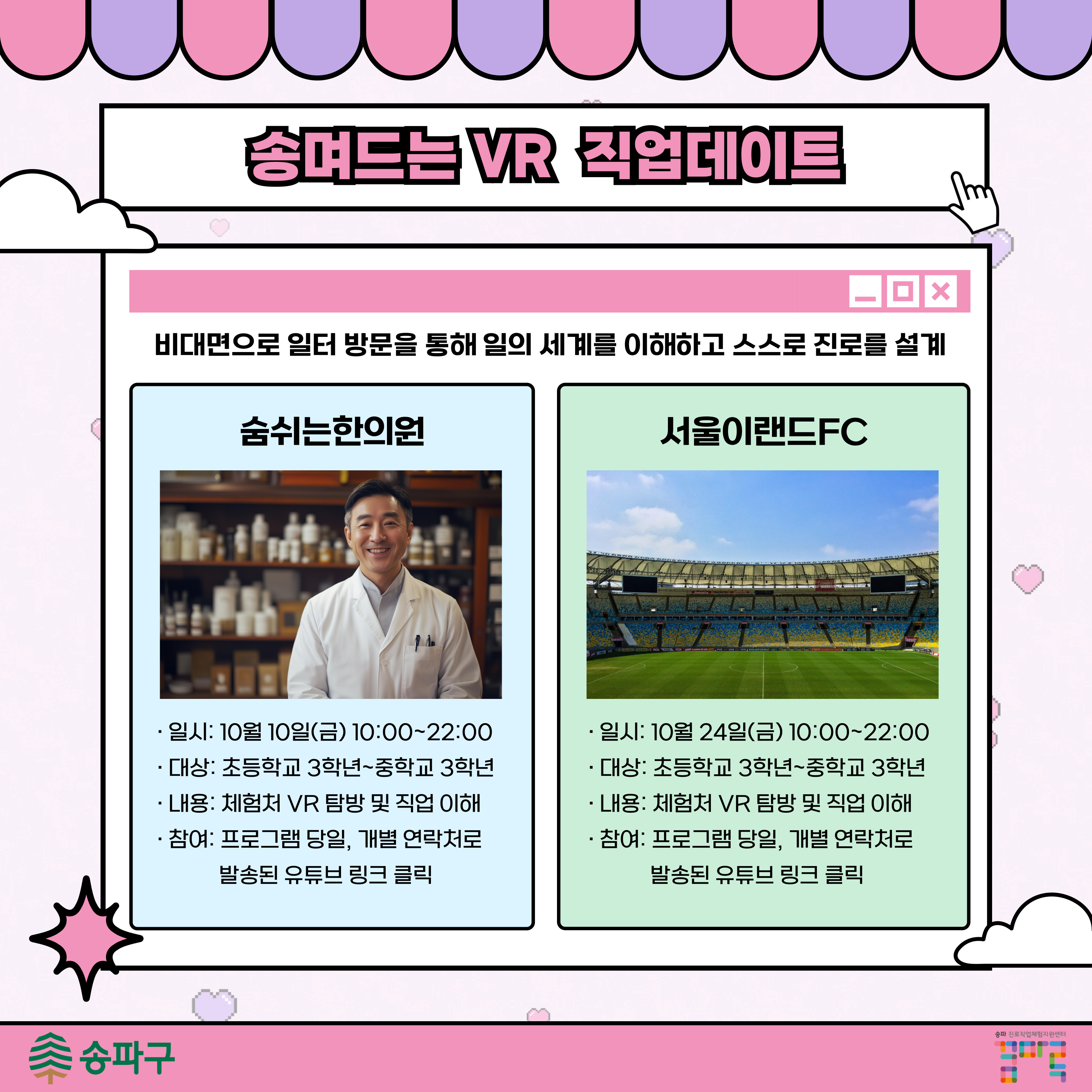 - 내용: 송파 관내 직업체험처 비대면 탐방 및 직업 이해 (한의사, 스포츠마케터 등)