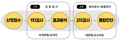내용 | 일시 | [1차 온라인 검사] 비대면형 (2차 진단일 기준 7일 전까지 검사 진행) [2차 대면 검사 및 진단] 매주 (목~금) 16:00~18:00 / 매주(토) 10:00~17:00 ※신청하신 진단 일자 및 시간 변경은 어렵습니다. |